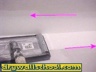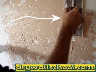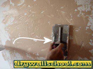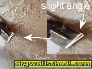 I am right handed so for me it feels comfortable going left to right. You could go the opposite direction if you want. Make sure the trowel is at a slight angle so the leading edge won't dig into the mud. Maybe 1/2 inch up on the front edge. Just pull the trowel along the wall applying just enough pressure to flatten out the texture. You don't have to go in a perfectly straight line. Relax and let it flow. The harder you push down, the flatter your texture will become.